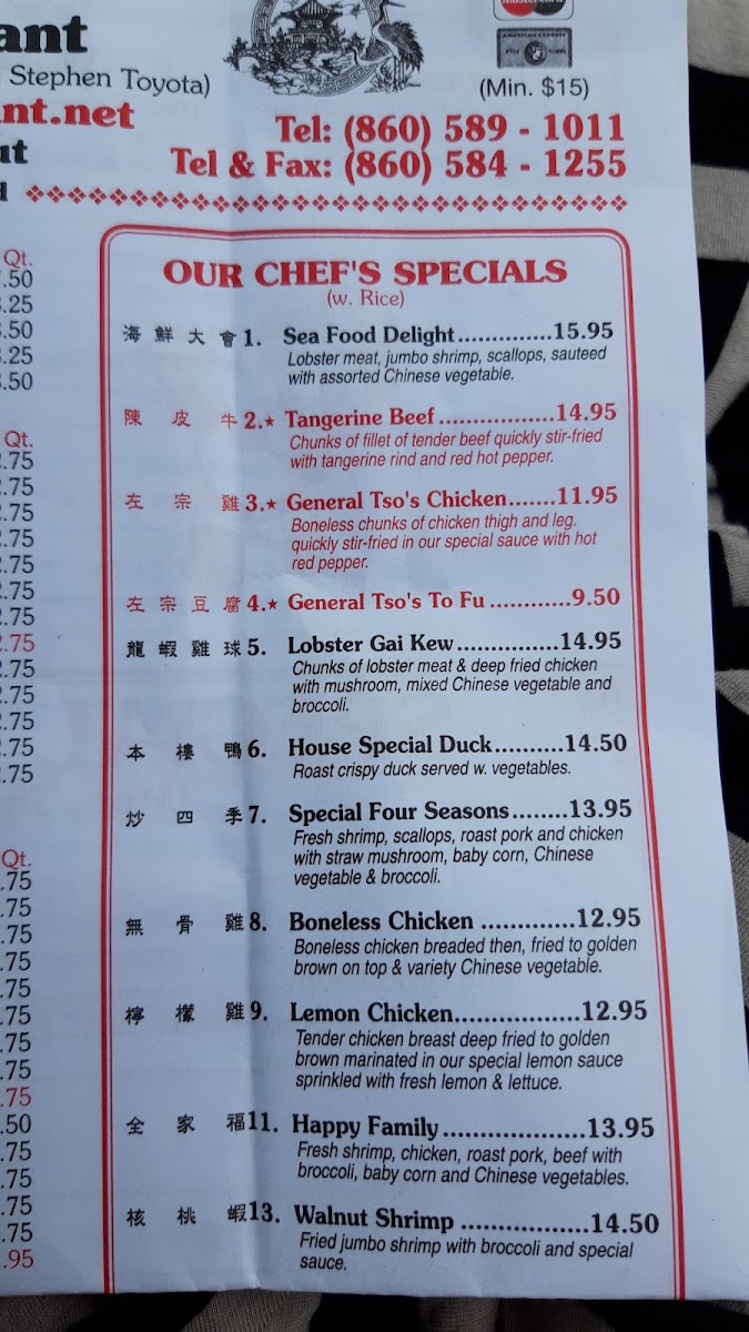 You’ll find popular choices like General Tso’s Chicken, Boneless Spare Rib Combo, and hearty soups such as Vegetable Soup and Seafood Soup that provide a gentle warmth perfect for any season. The menu also features chef’s specials including Lemon Chicken, Walnut Shrimp, and House Special Duck — dishes that offer a little variety while staying true to the comforting flavors many appreciate.